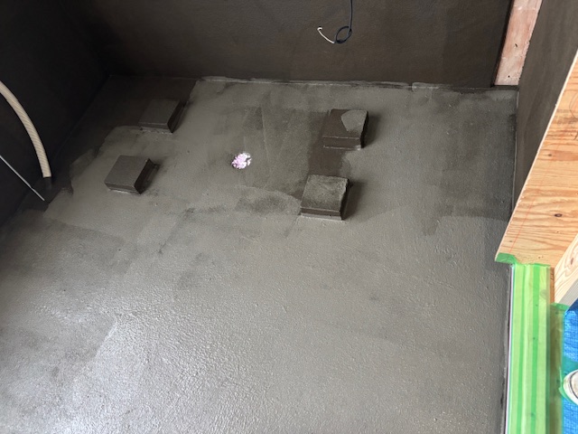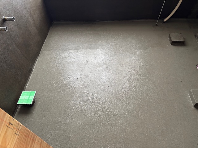 下の写真にあたりますこちらは、ポリマーセメント系塗膜防水材の施工写真です。