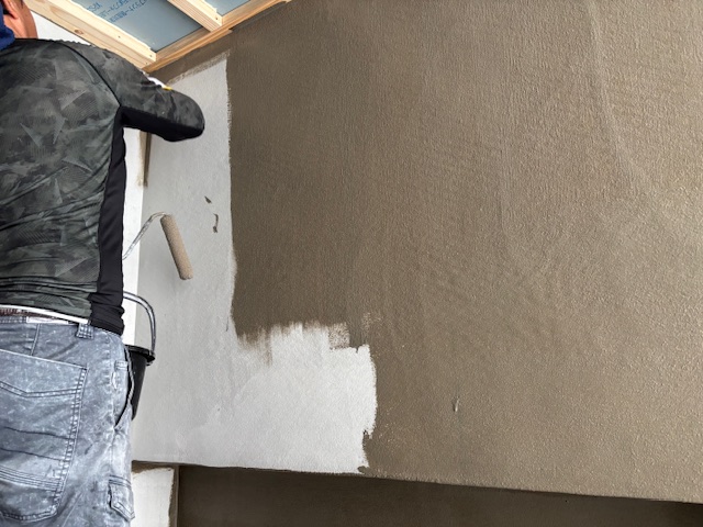 下の写真にあたりますこちらは、ポリマーセメント系塗膜防水材の施工写真です。