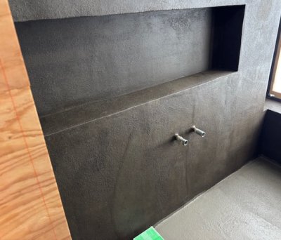本日は雨でしたが、室内の浴室で下地防水を施工させていただきました。