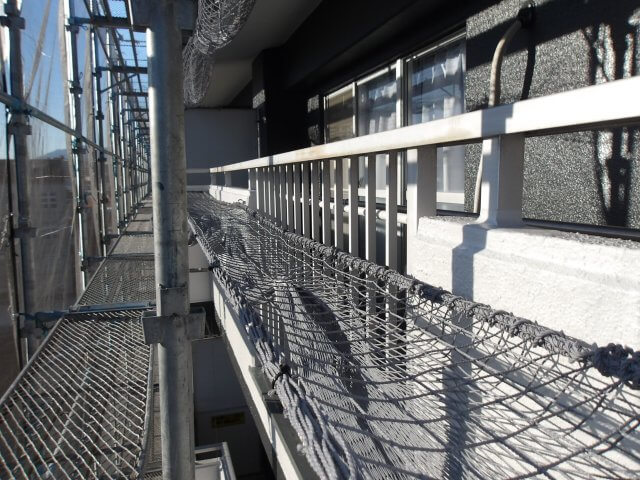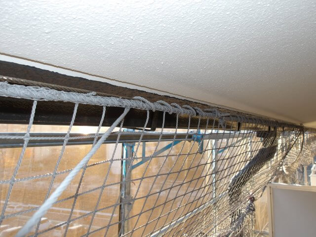 バルコニー内の全ての改修工事が完了したあと、ネットを下ろしてワイヤーにロープで一マスずつ縛り付けていきます。