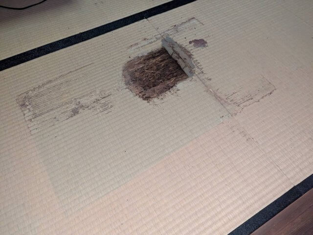 画像は段ボールを動かした際、段ボールと畳にシロアリ被害が発見されたものです。